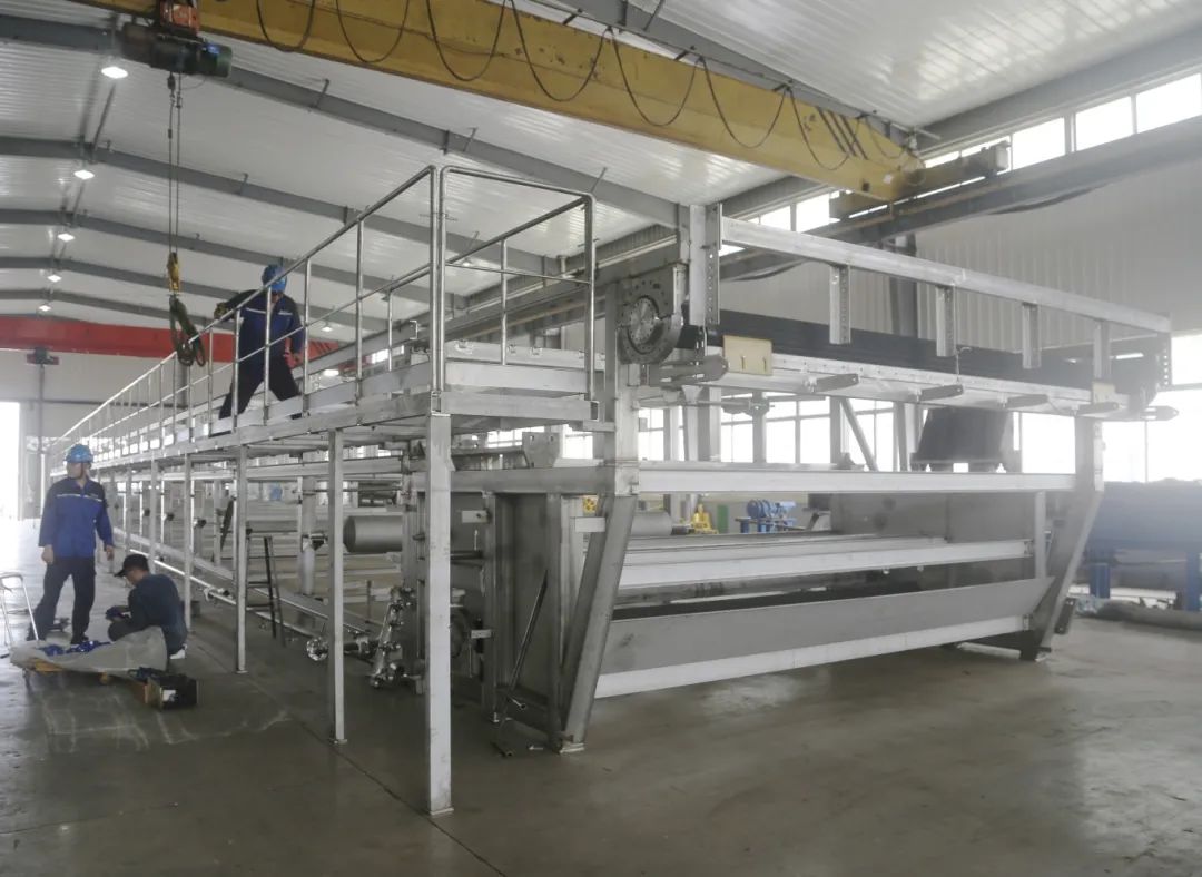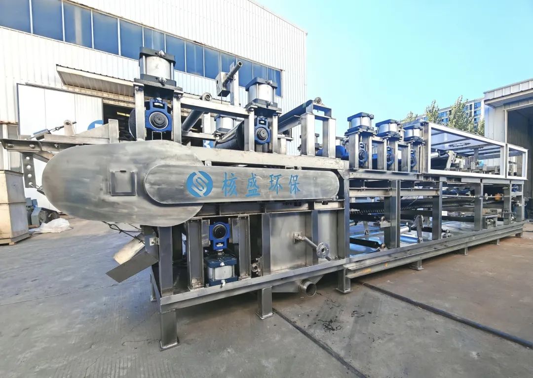本合同設備(橡膠帶式真空過濾機)用于塞爾維亞半水二水濕法磷酸項目半水磷酸反應料漿的過濾,項目地點位于塞爾維亞。車間積極響應,迅速行動,全體員工凝心聚力,團結一致,以飽滿的熱情投身到工作之中,迅速掀起生產大干的熱潮。與此同時,為了適應市場,實現設備高效、低碳、節能目標,由核盛團隊全新自主研發的——帶式真空加壓深度脫水一體機,目前已生產組裝完畢,投入試驗狀態。 該設備采用前段真空負壓預脫水、中段履帶保壓式正壓進一步脫水、后段使用橡膠復合真空輥剪切力的對輥碾壓進行深度脫水,可最大限度去除水份。該設備自動化程度高,可實現全自動運行,能完成連續喂料、過濾、洗滌、壓榨、濾布再生等功能,維護方便、生產效率、濾餅含水率極低,可解決很多行業在使用固液分離設備上的痛點,為客戶創造價值!相信該新產品一旦投放到市場,將會成為核盛新的經濟增長點。