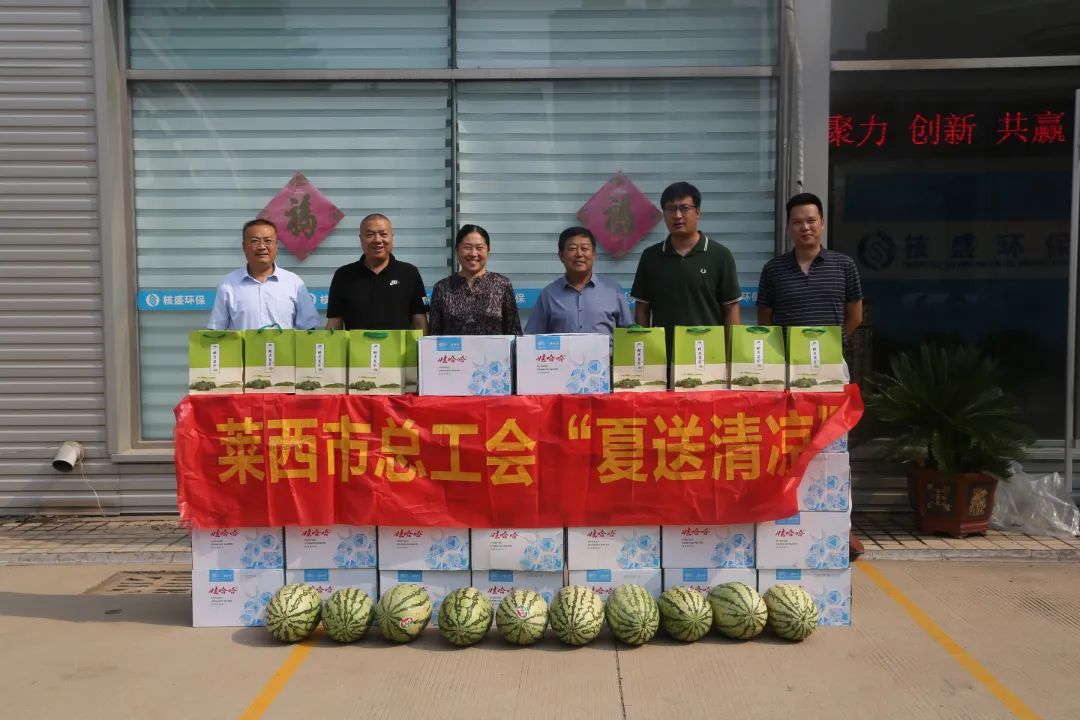 8月3日上午,萊西市總工會副主席郭樹林、汪麗英,水集街道辦總工會主席衣玉龍等領導班子來到我司,看望慰問在高溫酷暑中辛勤工作、默默奉獻的一線員工,為始終奮戰在一線的“戰士”們,精心準備了實用的綠茶、西瓜、礦泉水等“清涼”物品,在炎熱的夏季送去清涼的關懷,公司總經理司亮、工會主席胡任民熱情接待。