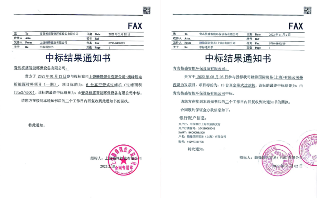 熱烈慶祝我司2023年2月18日再次中標(biāo)中國“鋰王”贛鋒鋰業(yè)大項(xiàng)目(六臺套超大型帶式真空過濾機(jī),過濾面積135平平方米/4500),加上2022年11月份中標(biāo)的贛鋒鋰業(yè)墨西哥項(xiàng)目(13臺套100平方帶式真空過濾機(jī)),設(shè)備總臺數(shù)達(dá)19臺套,兩次中標(biāo)是行業(yè)龍頭贛鋒鋰業(yè)對我司綜合能力的肯定,彰顯了公司技術(shù)和實(shí)力。這預(yù)示我司在鋰電新能源行業(yè)取得了優(yōu)異成績和重大突破,為公司進(jìn)一步開拓市場夯實(shí)基礎(chǔ)。核盛裝備,將為中國鋰電新能源行業(yè)裝備做出更大貢獻(xiàn)!